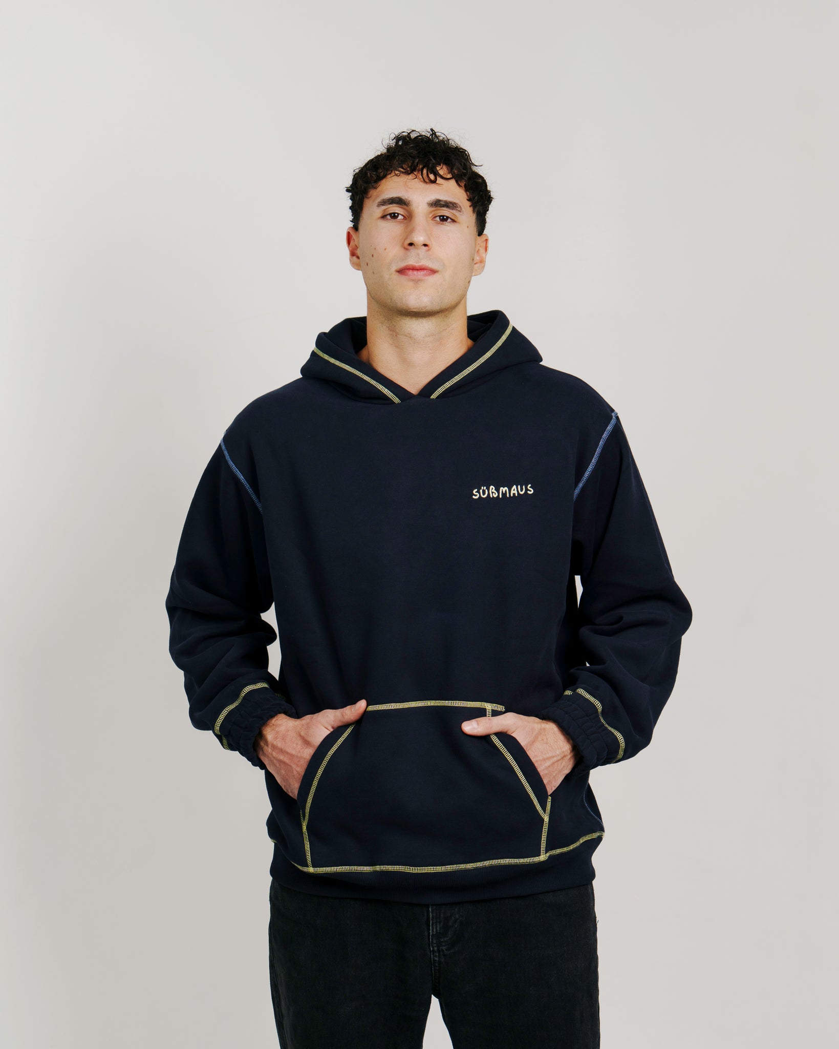 Das tiefe Marineblau bringt die Stickerei perfekt zur Geltung, während gelbe und lila Kontrastnähte deinem Look eine kreative Kante verleihen. Hochwertige Materialien sorgen für Komfort und Langlebigkeit, ob cozy zuhause oder stylisch unterwegs.